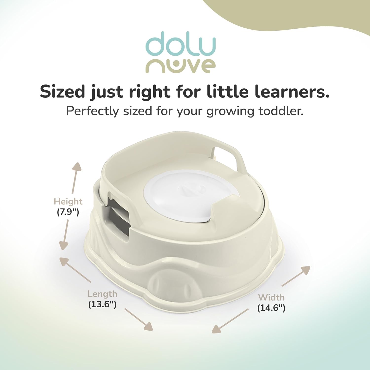 Text Reads: "Sized Just Right for Little Learners." – beige potty with size measurementsText Reads: "Sized Just Right for Little Learners." – beige potty with size measurements