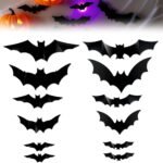 Halloween 3D Lighted Bats Set, 2026 Upgrade LED Purple Lighted 3D Bats Halloween Decoration, New LED Glowing Bat Group Hanging Wall Luminous Glow Clings Multipack (BlackX12)