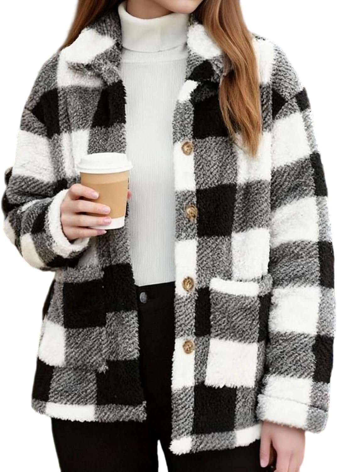Cathery Women Plaid Print Plush Jacket with Pockets Long Sleeve Lapel Collar Button Down Casual Fall Winter Jacket Coat