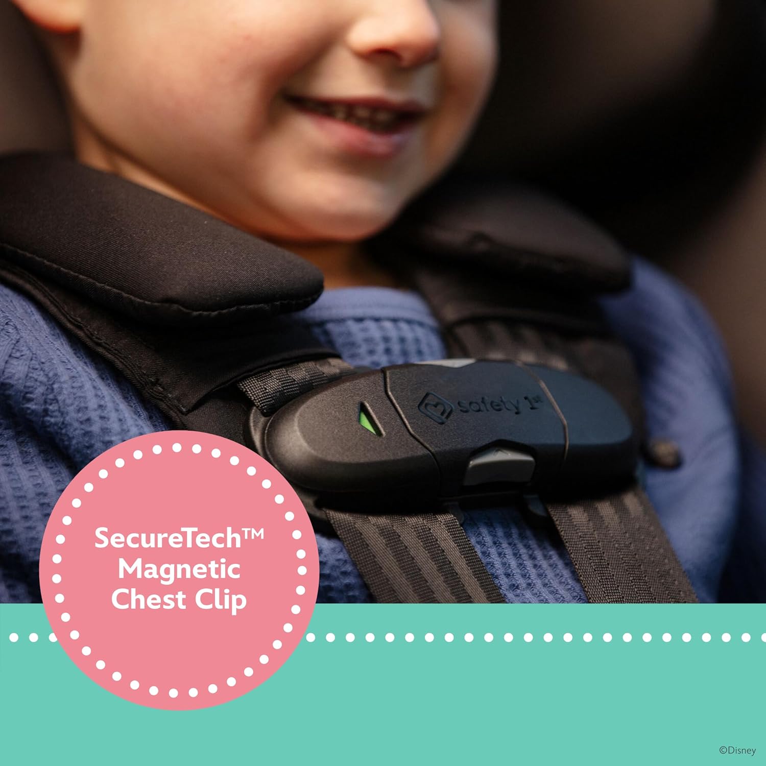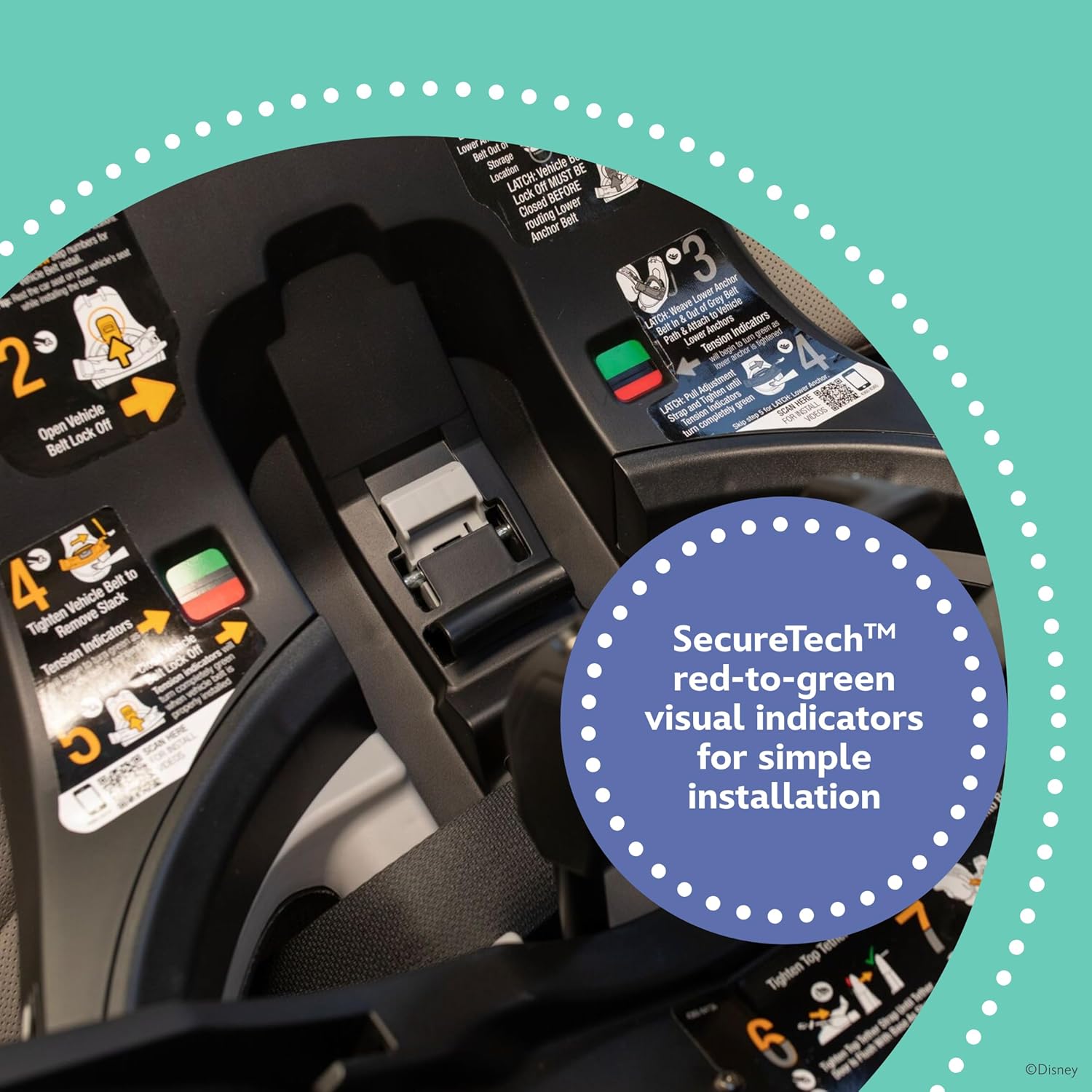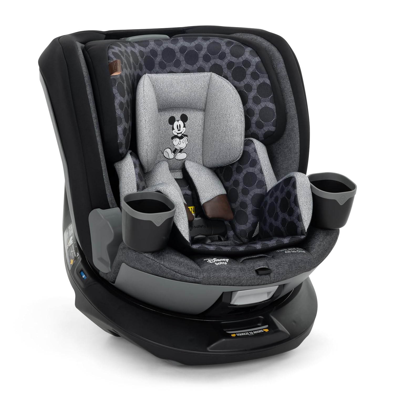 Going places is more fun for your little mouseketeer when they ride in their Disney Baby Turn and Go 360 Rotating All-in-One Convertible Car Seat. Plus, its more convenient and comfortable for you. Our innovative SafetySwivel 360 rotational technology lets you turn the car seat toward you, bringing you face-to-face with your little one. This rotation makes buckling and transferring your child in and out of the seat easier than ever and puts less strain on your back. Our all-in-one car seat solves the number one installation problem that 7 out of 10 parents unknowingly haveloose belt tension. Using SecureTechTM, Safety 1sts patent-pending tension-sensitive red-to-green indicators on the seats base, you can see when your belt has tensionjust look for the green!The Turn and Go meets or exceeds all federal safety standards and is National Highway Traffic Safety Administration (NHTSA) compliant. Attached connection cord ensures that the base and seat must be used together when installed.Installation of the base is the same for all 3 modes of use, alleviating the need to re-install the base as your child grows. Whether youre bringing home your new arrival or taking your big kid to school, youll travel in confidence through all their stages, from birth to 10 years in all 3 modes: rear-facing (540 lbs., 19″40″), forward-facing (3065 lbs., 34.4″49″), and belt-positioning booster (40100 lbs., 43.4″52″).Actual fit may vary. Not all children will comfortably fit in the seat for the full weight and height ranges listed.