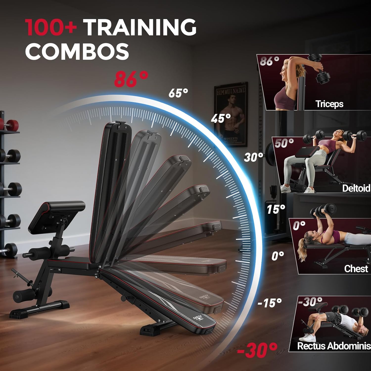 【3-in-1 Total Body Training Bench】Unleash full versatility in your home gym with this all-in-one powerhouse. It combines a multifunctional weight bench, adjustable preacher curl pad, and smooth leg extension for complete body sculpting. Switch from curls to presses to leg training in seconds — the quick-release spring lock makes one-handed adjustments effortless. One bench, endless workouts.