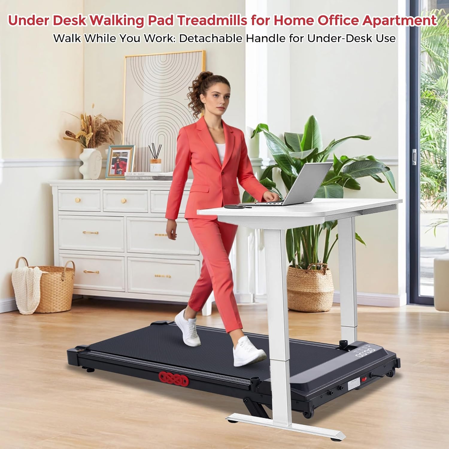 【2-in-1 Detachable Handle Treadmill】Effortlessly switch this treadmill with handles into a streamlined under desk walking pad in mere seconds. This walking pad with handlebar toggles smoothly between walking and working modes, making it a standout pick for small treadmills for small spaces and a seamless fit for office fitness needs