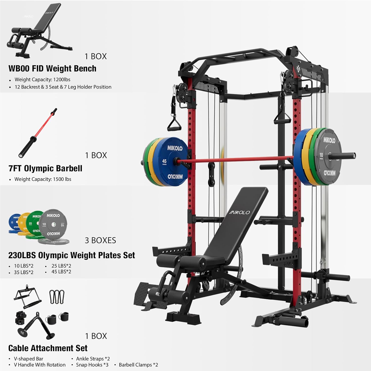 Mikolo Power Cage, 2000LB Power Rack with Independent Dual Pulley System, Multi-function Home Gym Workout Machine for Cable Crossover