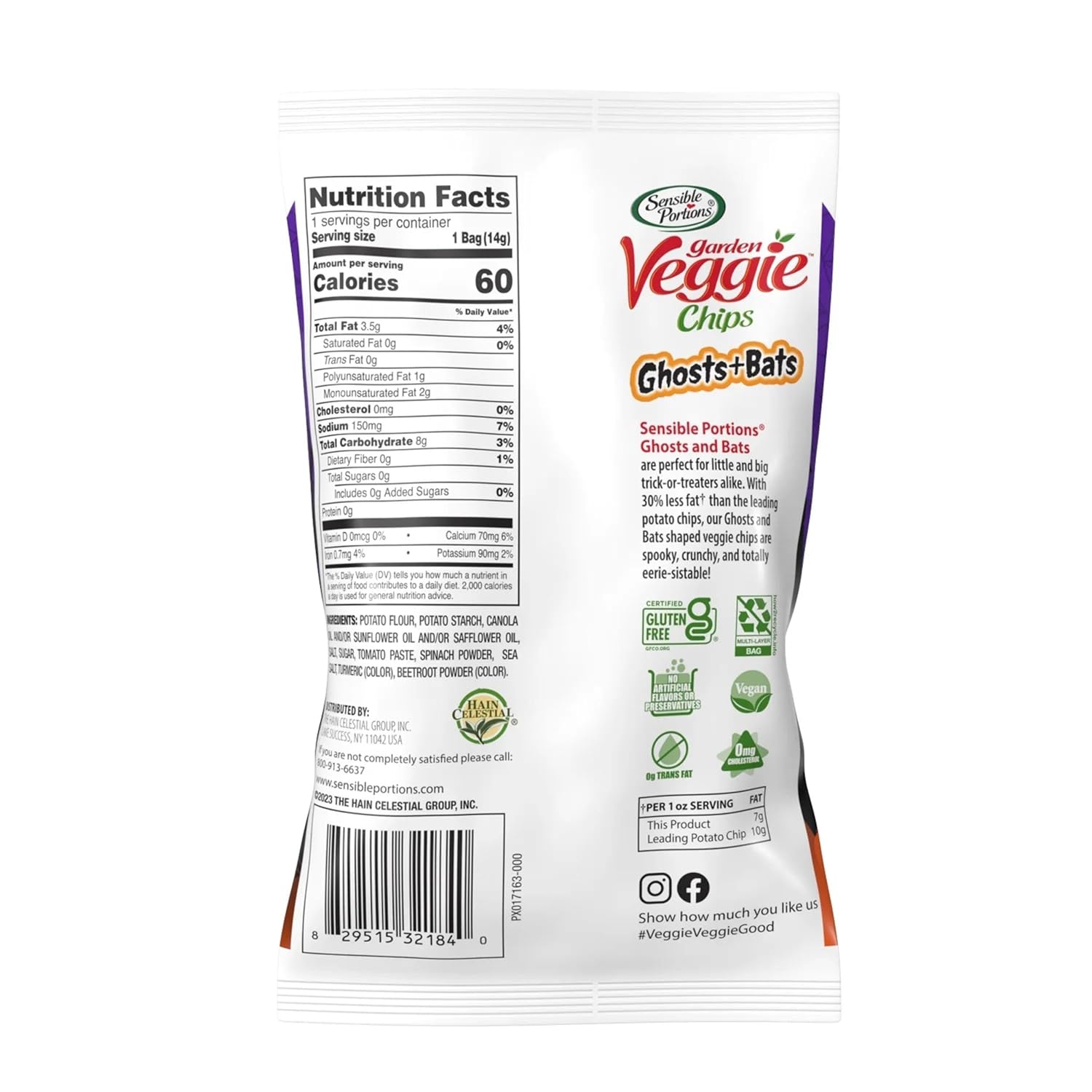 Sensible Portions Garden Veggie Ghosts & Bats Sea Salt Chips are a healthy alternative to conventional trick-or-treat fare. Our seasonal chips are made with potatoes and vegetables grown in a sun-splashed garden, so you can feel good about passing them out to tiny ghosts and ghouls. The fun shapes are a big hit with trick-or-treaters. Sensible Portions Sea Salt Garden Veggie Ghosts and Bats Chips are packaged in individual-sized bags that are perfect for classroom parties or lunchbox treats. These spook-tacular shapes have the crispy crunch and taste-bud-tantalizing flavor you want in a snack, but without all of the artificial flavors and artificial preservatives.