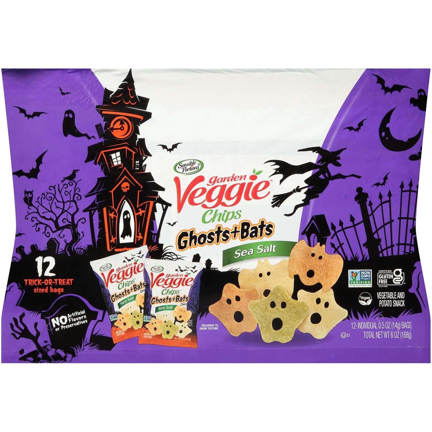 Twelve trick-o-treat snack sized bags of ready-to-eat Sensible Portions Garden Veggie Ghosts & Bats Sea Salt Snack Chips