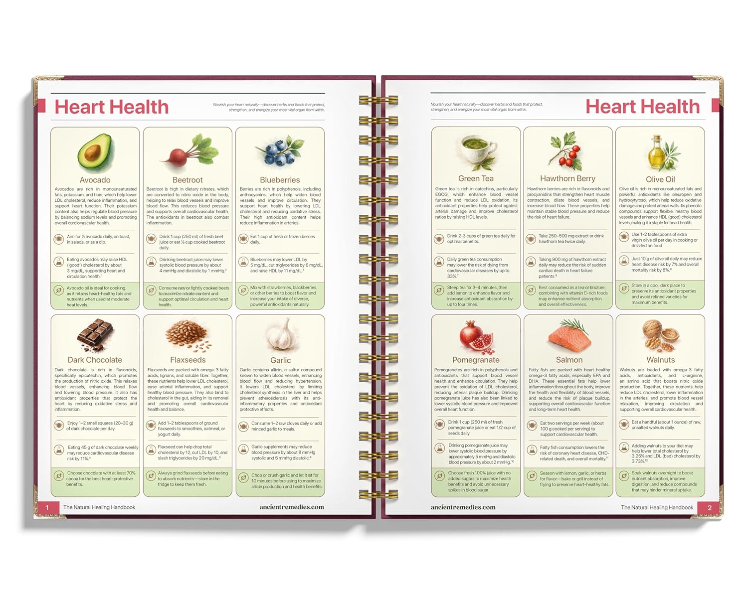 Over 75 pages of natural wisdom laid out in a beautifully designed spiral-bound format, making it easy to follow along while you prepare your remedies.Dedicated sections for major health concerns including heart health, blood sugar management, focus enhancement, and blood pressure balance.Step-by-step herbal recipes for teas, tinctures, and natural solutions—with clear instructions and complete ingredient lists.Traditional uses of herbs explained in plain language, so you’ll always know why you’re taking each remedy and what it’s doing for your body.Color-coded chapters and a highly organized structure that make it quick and effortless to find exactly the remedy you need.Flat-lay spiral binding, so your handbook stays open on the counter while you prepare remedies in your kitchen.A beautiful burgundy cover with botanical illustrations that makes this both a practical reference and a keepsake you’ll treasure.