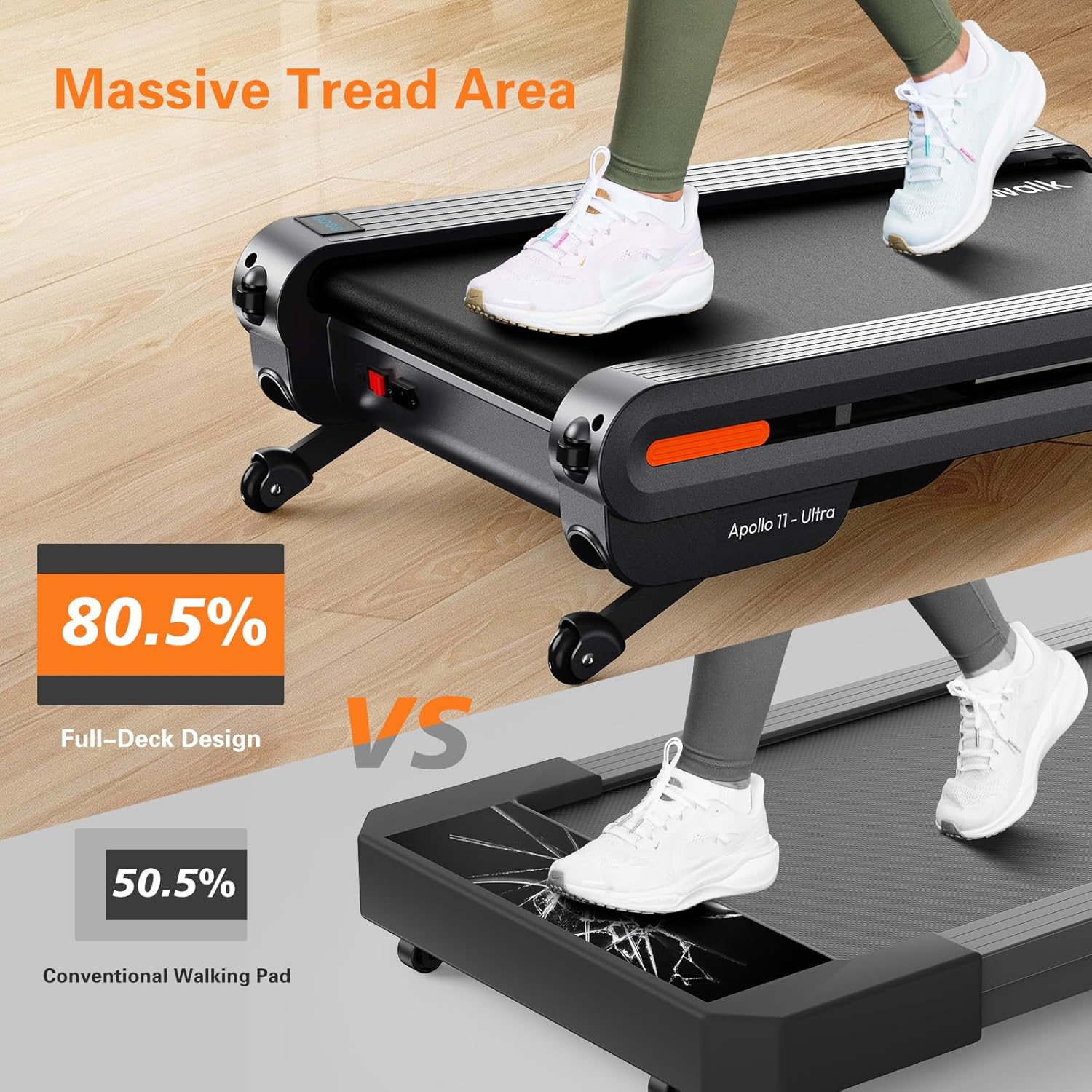 đăFull Deck – DeckMax and Space SavingăInnovative Full-Deck Belt-to-Body (hidden motor) design delivers 30% more usable running belt in a more compact frame – enjoy a roomier stride without the bulk, easier to move and store. Light commercial 43″x18″ extra-wide belt extends to borderless edges with clean lines. Stores vertically in 1.9 sq.ft footprint – 80% space saved (fits under beds/sofas with 4-wheel mobility).