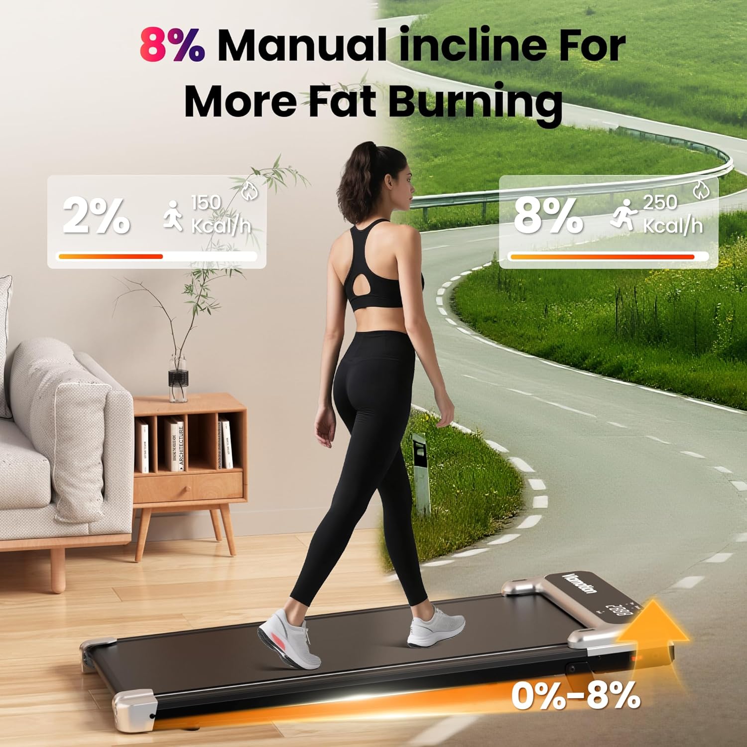 Incline Walking Pad:The walking pad treadmill comes with an 8% incline. By tilting, it can bring you a higher fat-burning effect, accelerate fat burning and calorie consumption, allowing you to enjoy the fun of mountain climbing at home.